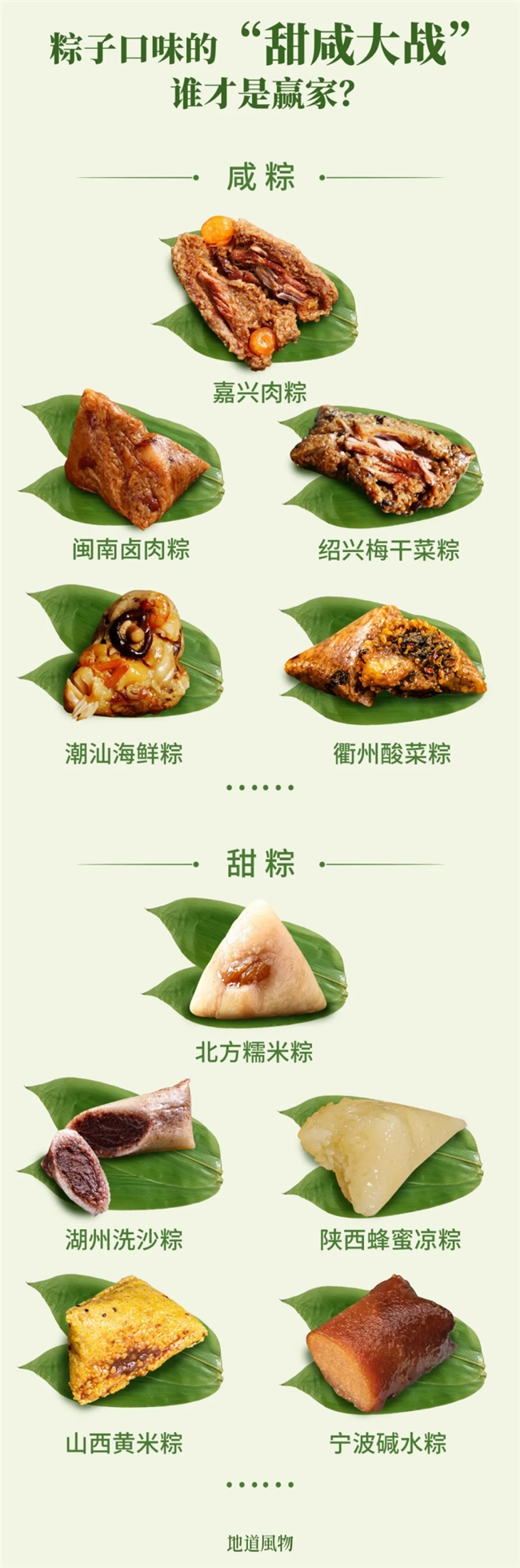 最早的粽子只有白粽一种风味,而如今,每年端午时节都要拉开一场“咸与甜”的赛博擂台战,咸党认为咸粽馅料丰富,甜党则说甜粽甜过初恋。南北方食客关于粽子的热烈交锋,已经成了端午节的必备环节。