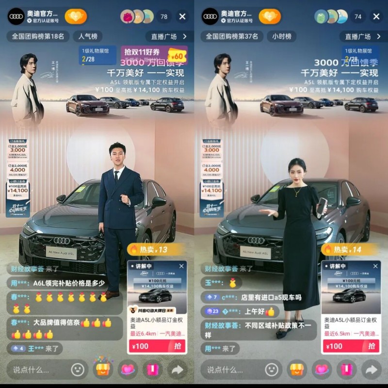一身赫本风黑裙,搭配黄金项链和精致妆容,奥迪官方直播间的女主播,抬手举足尽显端庄。男主播们也是西装革履,精英范儿十足,言谈间尊称观众为“领导”,与奥迪豪华商务的调性非常契合。