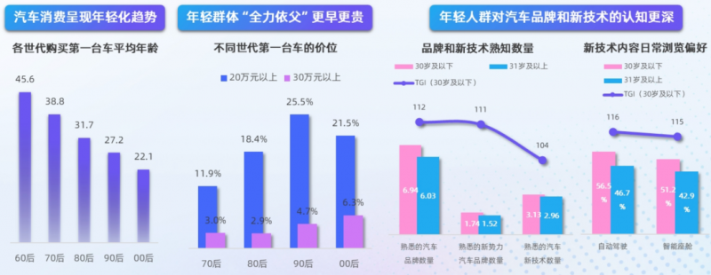 另据CTR报告,当前中国车主首次购车的平均年龄已降至30.5岁。 其中,00后首次购车年龄更是低至22岁。购车群体年轻化,也与抖音平台的活跃用户高度重合。