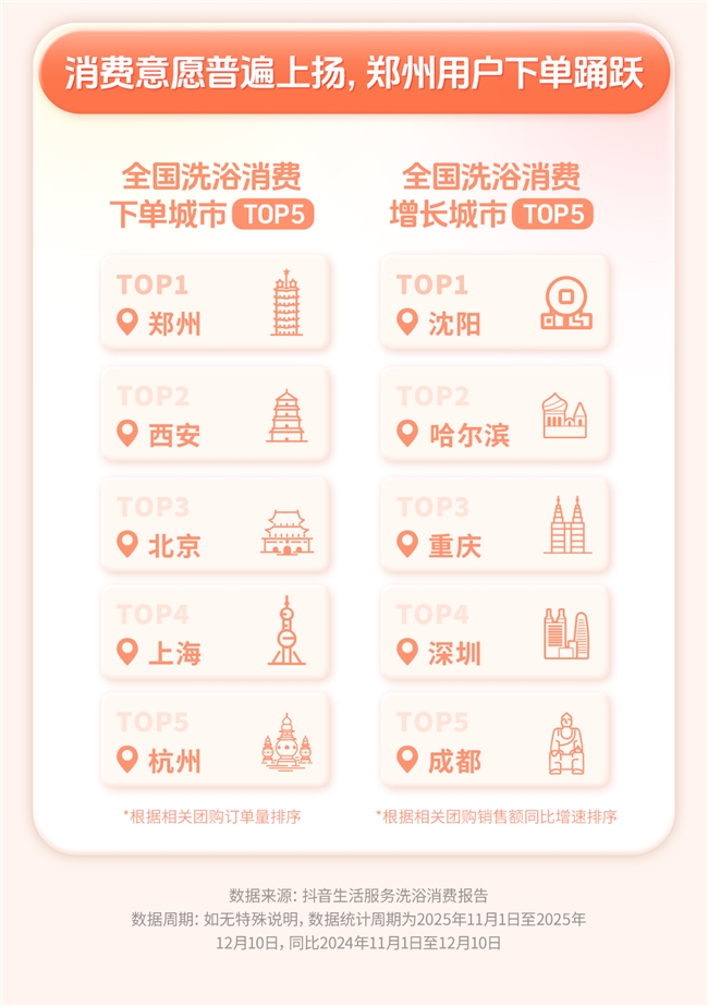 12月22日,抖音生活服务发布《洗浴消费报告》(下称“报告”)。天气转冷,洗浴、汗蒸和泡汤等关键词在抖音的搜索量明显上涨。报告显示,11月1日至12月10日,抖音平台洗浴泡汤相关内容数同比涨43%,分享量同比涨52%。平台相关团购订单量同比增长超38%,销售额同比涨50%。11月至今,下单用户平均每人洗浴或泡汤2次。