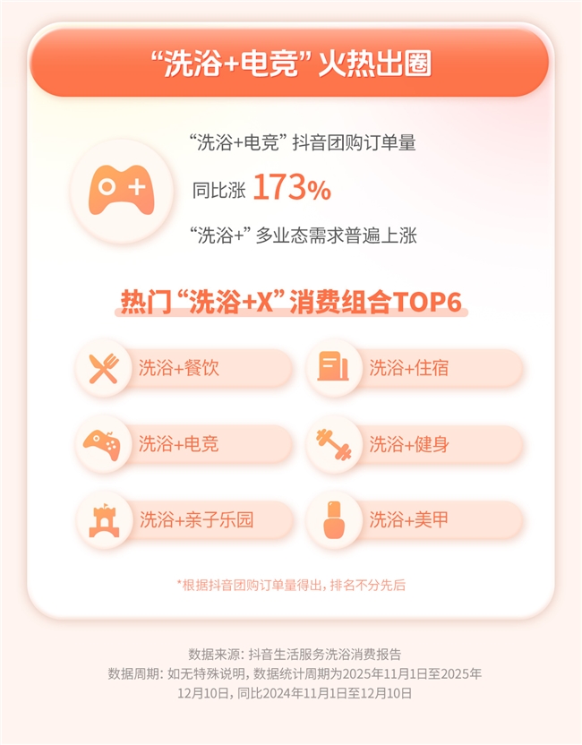 在洗浴中心可以做哪些事?报告显示,洗浴消费的场景越来越多元化,洗浴泡汤成为用户聚会的新选择。抖音多人(≥2人)的洗浴相关订单同比涨28%,销售额同比涨46%。朋友聚会、家庭休闲、闺蜜聚会、情侣休闲、个人放松、公司团建等场景越来越普遍。“洗浴+餐饮”“洗浴+住宿”“洗浴+电竞”等的“洗浴+”团购组合越来越多样,带动多业态爆发。