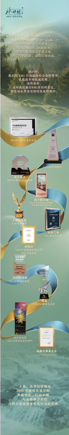 将ESG专项工作转为系统性能力的长期建设,是水井坊近年来企业治理与经营的重要方向。水井坊将ESG(环境、社会和公司治理)理念和实践深度融入企业战略和经营管理各个环节,探索出独具特色的可持续发展之路,也获得社会各界的广泛赞誉与奖项。